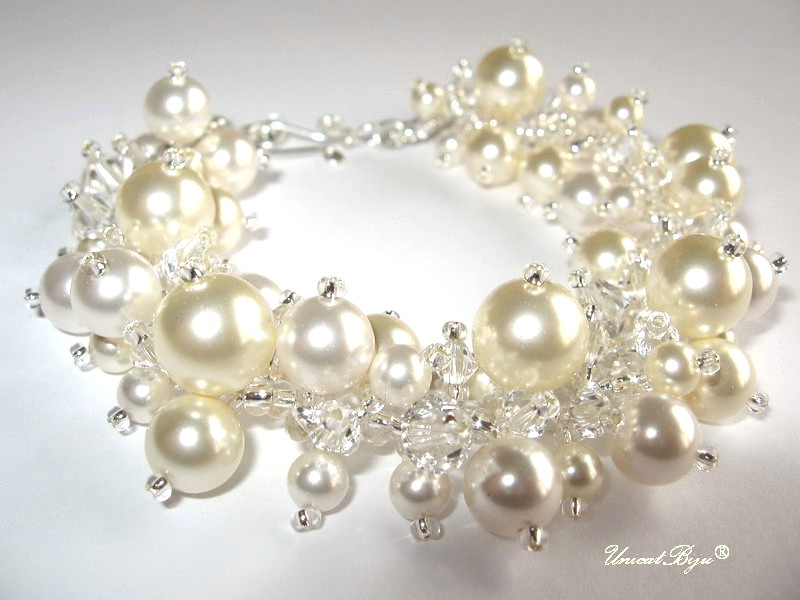 Set bijuterii mireasa – bratara, cercei, inel – Set Creamy cu perle 5, 8 si 10 mm, culori Crystal White si Crystal Cream si cristale bicon 4 si 6 mm culoare Crystal.