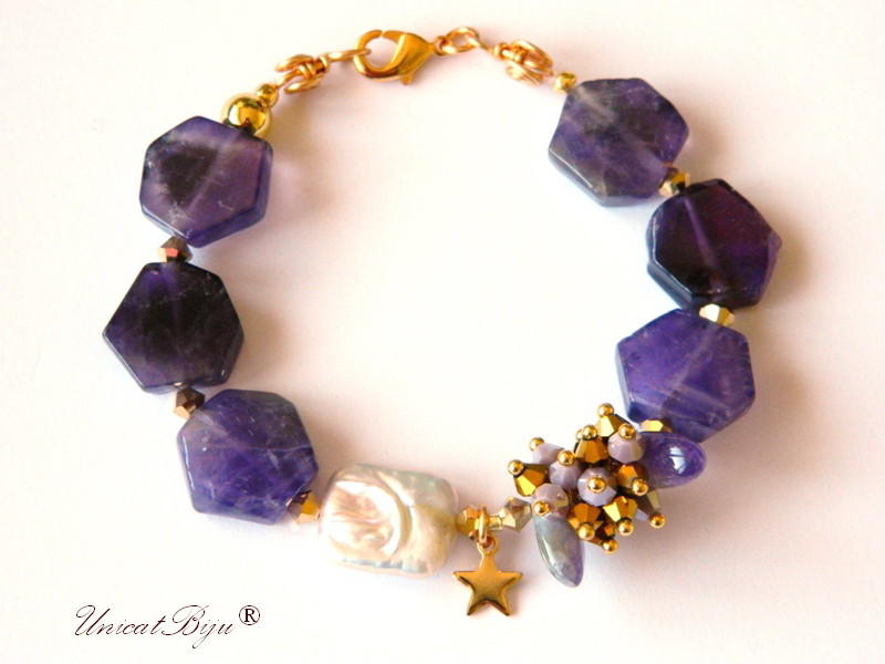 ComparaBratara lucrata manual cu pietre semipretioase – perla Keshi baroc 14 x 18 mm, ametist 16 mm, cristale Preciosa®, montate cu accesorii metalice inox electroplacat cu aur.