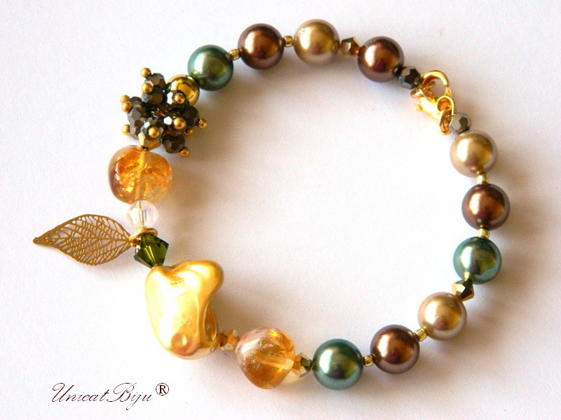 Bratara lucrata manual cu pietre semipretioase – citrin 10-14 mm, perle Seashell 8-18 mm, cristale Preciosa®, montate cu accesorii metalice inox electroplacat cu aur.