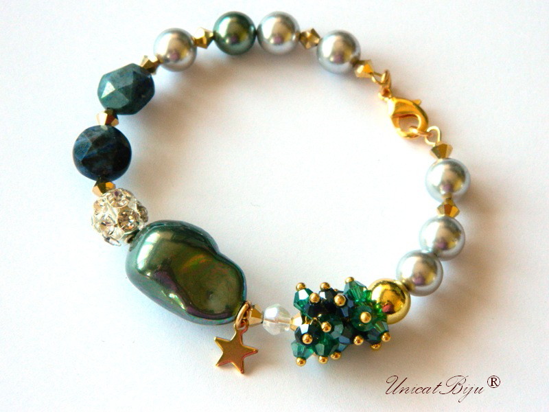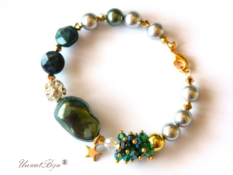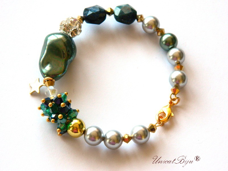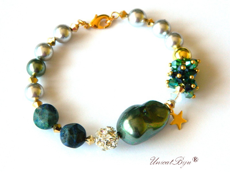ComparaBratara lucrata manual cu pietre semipretioase – azurit fatetat 10 mm, perle Seashell 8-18 mm, cristale Preciosa®, montate cu accesorii metalice inox electroplacat cu aur.
