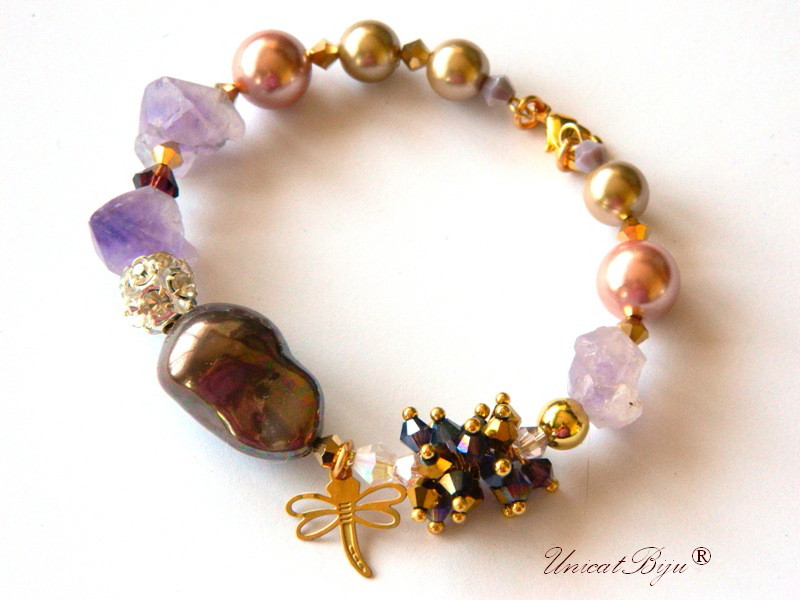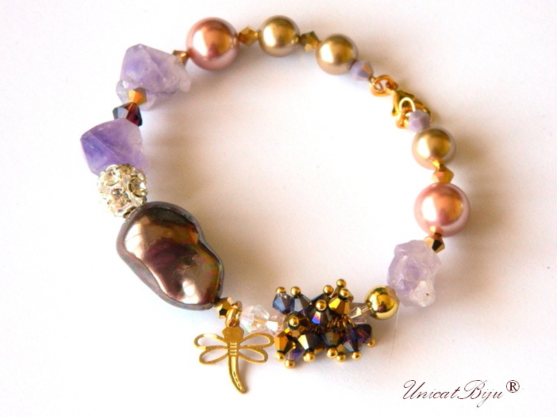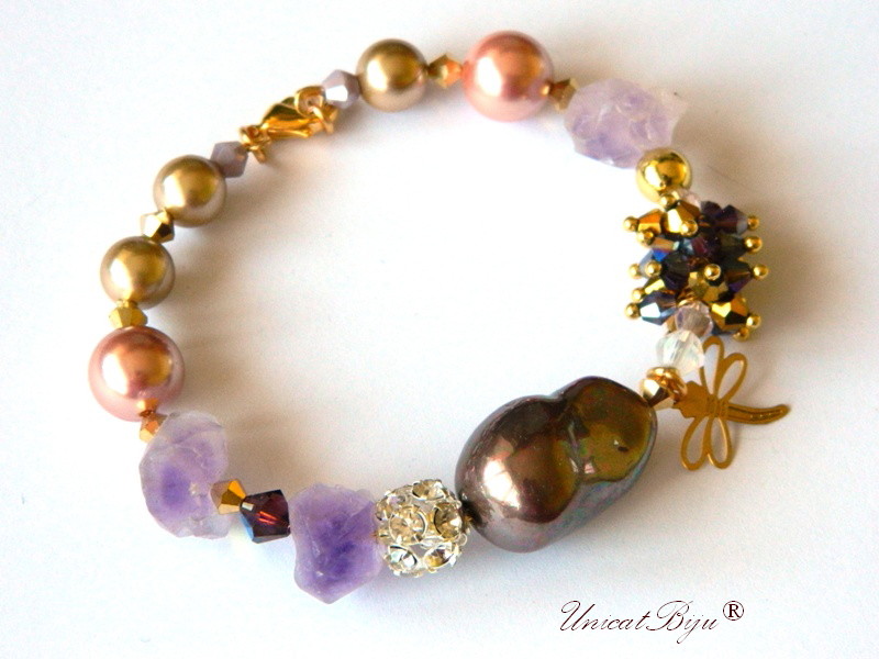 Bratara lucrata manual cu pietre semipretioase – ametist brut 10-13 mm, perle Seashell 8-18 mm, cristale Preciosa®, montate cu accesorii metalice inox electroplacat cu aur.