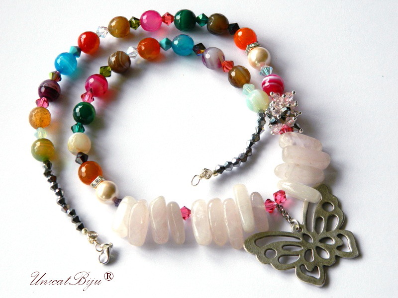 Colier lucrat manual cu pietre semipretioase – agat Dragon Veins fatetat 10 mm, perle Seashell 24 mm, cuart roz free form 10-14 mm, cristale Preciosa® 4-6 mm, montate cu accesorii metalice placate cu argint.