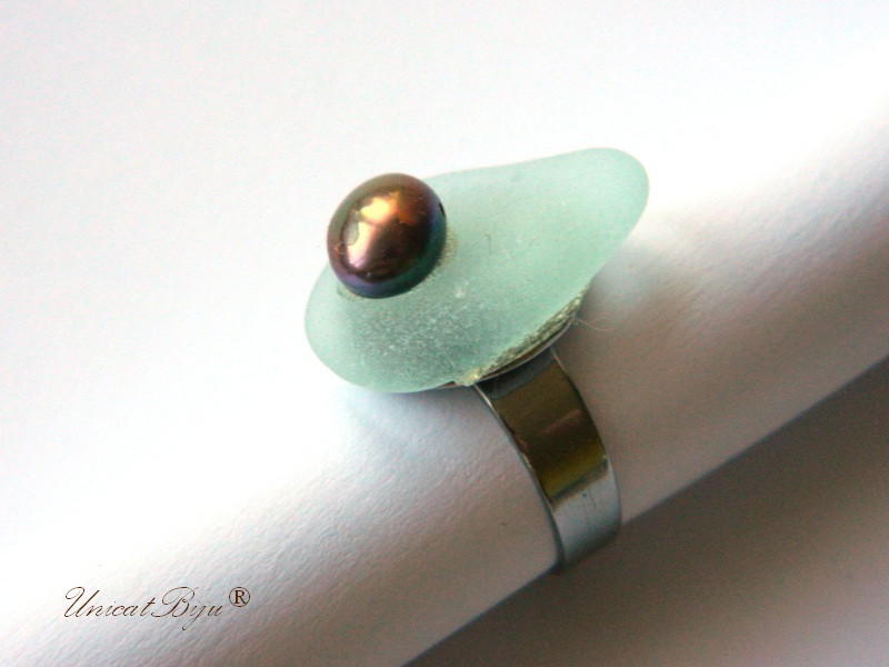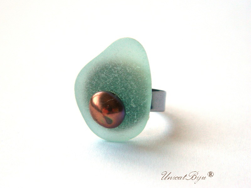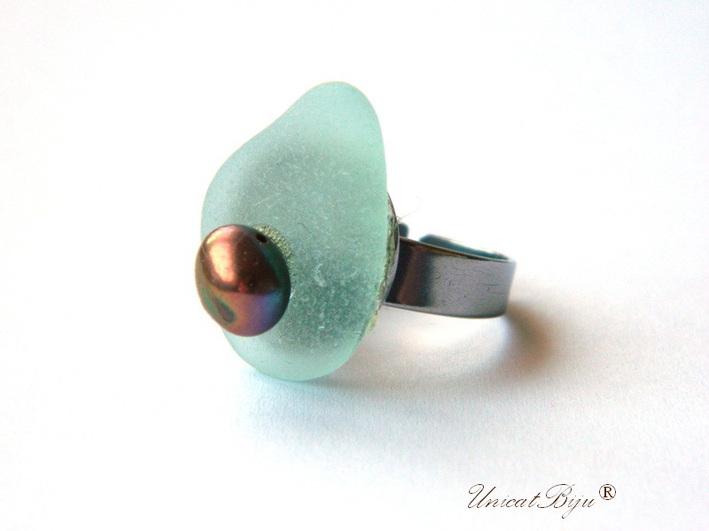 Inel lucrat manual cu pietre semipretioase – sticla de mare naturala, perla Keshi, montate in baza inel reglabila, inox placat cu argint.